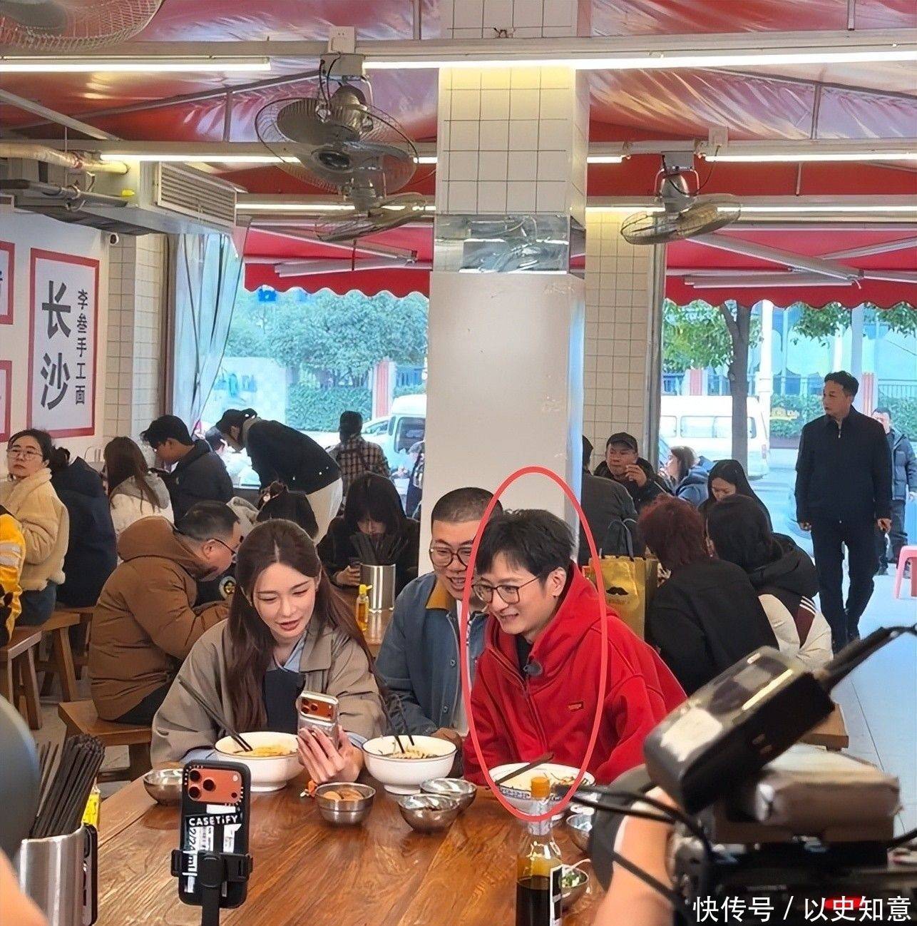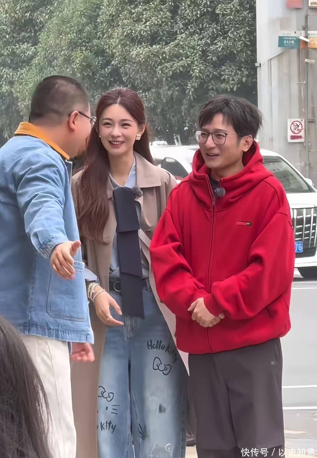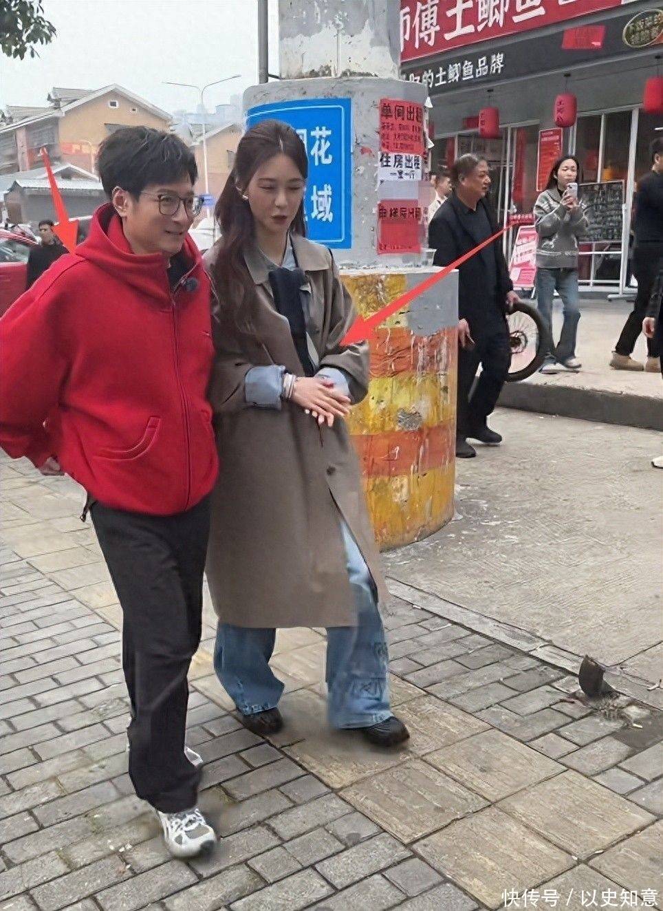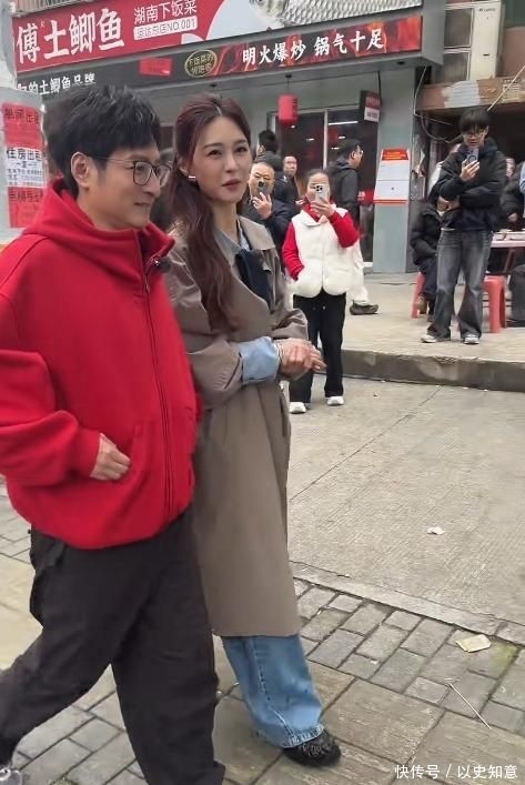 49岁的他身穿酒红色宽松夹克,肩线微塌、袖口略宽,黑框眼镜下的眼周略有浮肿,双颊丰满度提高显着,下颌边际线条趋于柔柔,举座概括更显亲和温厚。当两东说念主并肩行交运,视觉要点当然落在沈梦辰身上,有年青网友笑称:“像姐姐带着自家亲戚逛市集。”