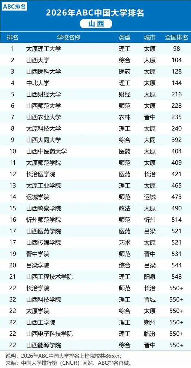 2026年山西省的高校排名情况也还是恰当公布,新的排名榜单又给省内高级西席的发展指明了标的。按照最新的ABC中国大学排名,山西省共有27所本科院校入选,基本上呈现出了梯队分层的态势。太旨趣工大学在天下排名第98位,山西大学排在第104位,山西医科大学排在第128位,这三所高校扫数组成省内第一梯队。中北大学、山西财经大学、山西师范大学等学院组成了中北大学、山西财经大学、山西师范大学等学院组成的第一梯队,实力很强。而在榜单的中后段,一些有特质的高校也出现了我方所处的位置,山西捕快学院、忻州师范学院、晋中学院这些高校在榜单中的排名比拟罕见。